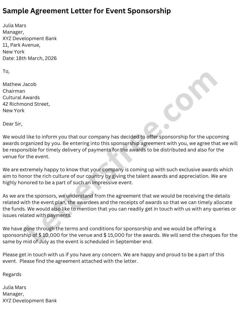 Given below is a format example of agreement letter for event sponsorship which you can use for creating your own draft. Such letters should be very clear and well stated.