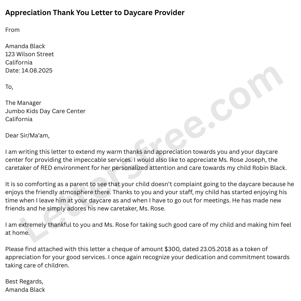 Use the free template of appreciation letter to the daycare provider by parents. Customize this example format to write a personalized thank you letter to daycare. Refer to the sample letter for help.