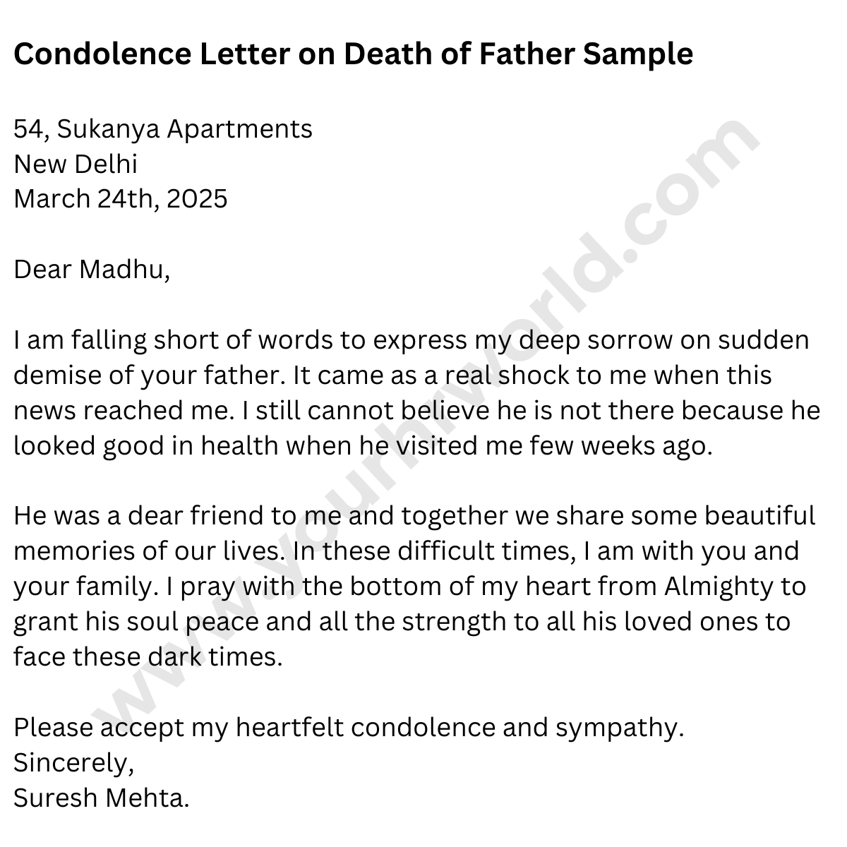 If you receive news of your friend’s or relative’s father’s demise then writing Condolence Letter on Death of Father is the most apt way to send your condolence. Writing a condolence letter on death of colleague’s father, employee father, friend’s father is certainly not easy because you don’t know what to write in this kind of a letter. In this situation, you need a condolence letter on death of father sample to help you write a simple but expressive condolence letter on death of father.
