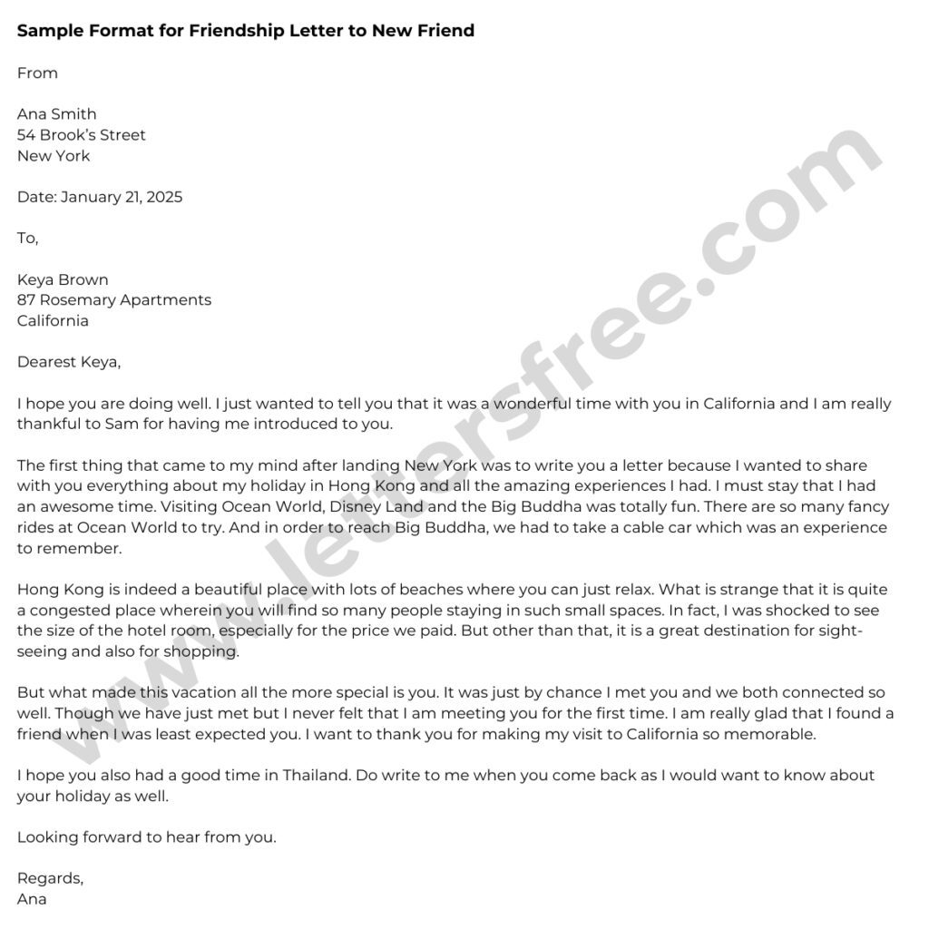 Sample Format for Friendship Letter to New Friend