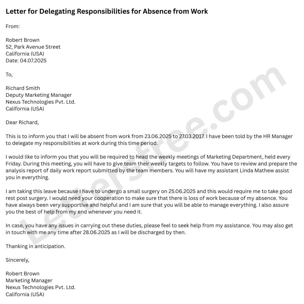 Sample Delegation Letter to Assign Responsibility for Absence from Work