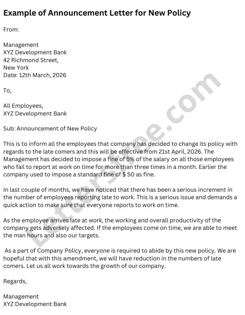 This is to inform all the employees that company has decided to change its policy with regards to the late comers and this will be effective from 21st April, 2026. The Management has decided to impose a fine of 5% of the salary on all those employees who fail to report at work on time for more than three times in a month. Earlier the company used to impose a standard fine of $ 50 as fine.