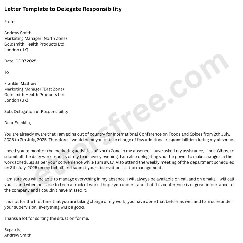We have come up with a sample format for letter to delegate responsibility to help you. Use this example delegation letter to draft a letter for your situation.